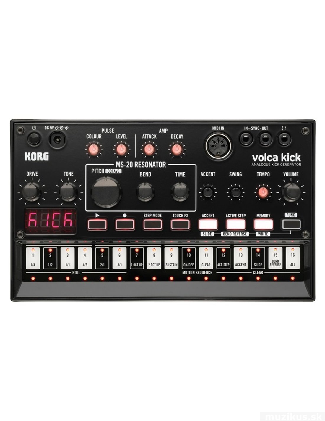Analogový Kick Generator/Kick Synthesizer, 16-ti krokový sekvencer, MS-20 Resonator: Pitch / Octave, Bend, Time, Sluchátkový výstup