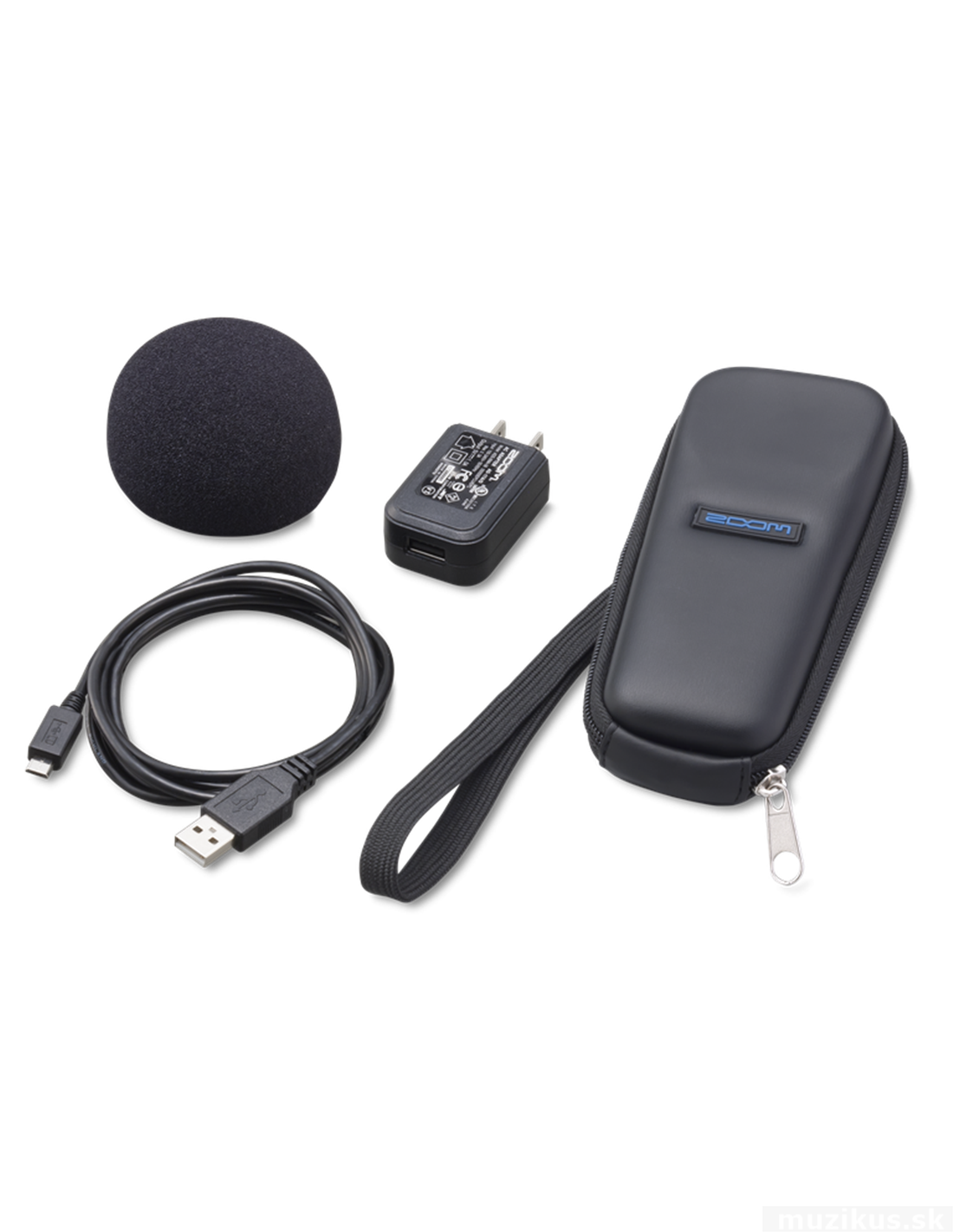 Sada příslušenství pro Zoom H1n, obsahuje: polstrované pouzdro, pěnovou protivětrnou ochranu, AC adaptér AD-17 (typ USB), USB kabel